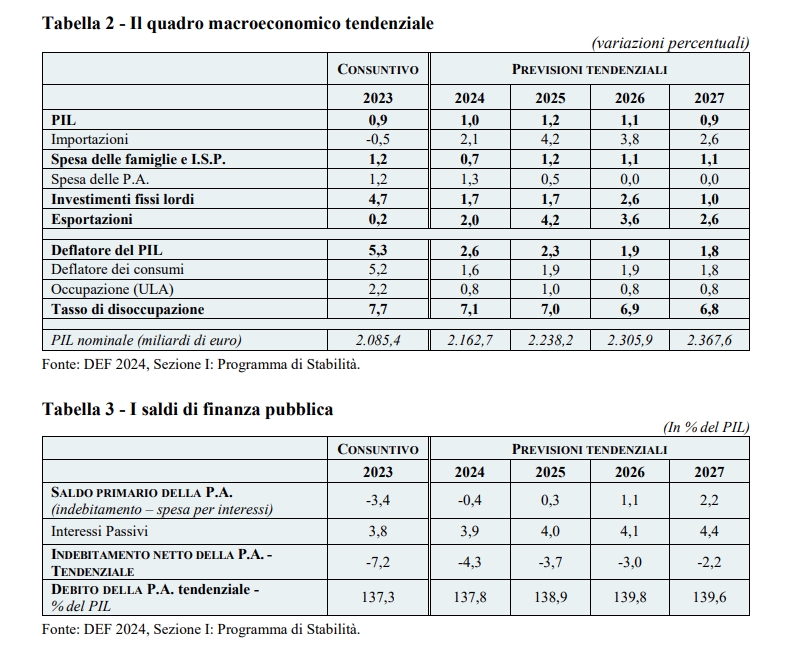Queste le previsioni del Governo per i prossimi anni (https://tinyurl.com/2p9mmrkb ). Sono previsioni cautamente ottimistiche, e infatti in molti dubitano sul fatto che si realizzeranno. In allegato due tabelle tratte dal DEF, la 2 e la 12.
