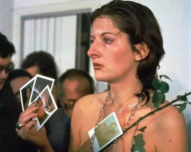 All’inizio, timidezza. Tenerezze, sfioramenti. Poi, in rapida successione: punture, vestiti tagliati, strappati, pelle incisa, tagliata, sangue fatto colare, succhiato, una rosa conficcata nel ventre, una lama puntata alla gola. La pistola presa in mano. Alla fine della performance, quando la Abramović si alzò e mosse un passo, i partecipanti fuggirono. Non ressero la presenza cosciente, lo sguardo dell’essere umano che avevano appena brutalizzato.