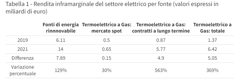 Nel 2021, lo stesso settore ha ottenuto rendite inframarginali per 6,42 miliardi, di cui 4,2 miliardi concentrati negli ultimi quattro mesi dell’anno. In particolare, sull’energia prodotta a partire da gas acquistato spot la rendita è stimabile in circa 650 milioni, mentre sugli acquisti a lungo termine il margine è di 5,77 miliardi. Quindi è evidente come i contratti a lungo termine hanno consentito di ampliare i margini a dismisura, con un incremento dell’ordine del 500 per cento: il motivo è dovuto al fatto che le imprese produttrici di energia elettrica hanno venduto elettricità ad un prezzo che riflette l’incremento del prezzo spot del gas, ma allo stesso tempo il gas utilizzato è stato comprato a prezzi molto più bassi stabiliti con contratti a lungo termine.